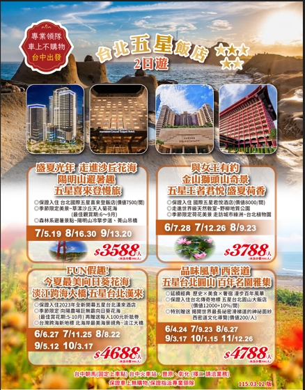 • 遊覽車車資,門票,午餐,住宿費用,飯店早餐,全程住宿2人1室,250萬旅遊責任險+20萬意外醫療險