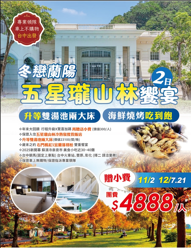 台中出發~冬戀蘭陽 海鮮燒烤吃到飽 五星瓏山林饗宴2日~升等