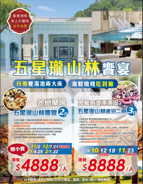台中出發~冬戀蘭陽 海鮮燒烤吃到飽 五星瓏山林饗宴2日~升等